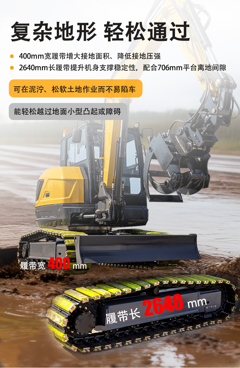 2. 复杂地形通过性强:400mm宽履带增大接地面积、降低接地压强,可在泥泞、松软土地作业而不易陷车;2640mm长履带提升机身支撑稳定性,配合706mm平台离地间隙,能轻松越过地面小型凸起或障碍。