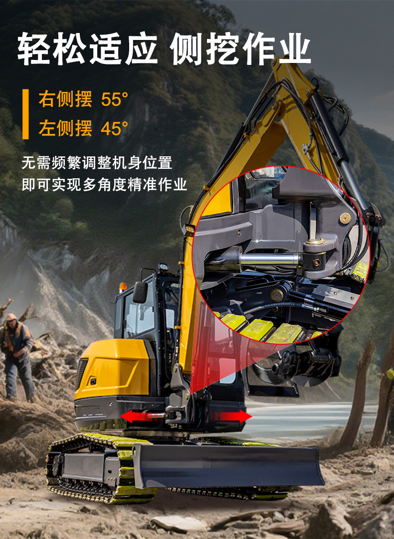7. 侧挖作业适应性突出:支持左45°、右55°侧摆角度,在边坡修整、沟渠侧壁开挖等场景中,无需频繁调整机身位置,即可实现多角度精准作业,尤其适合市政管线铺设时的侧边施工需求。