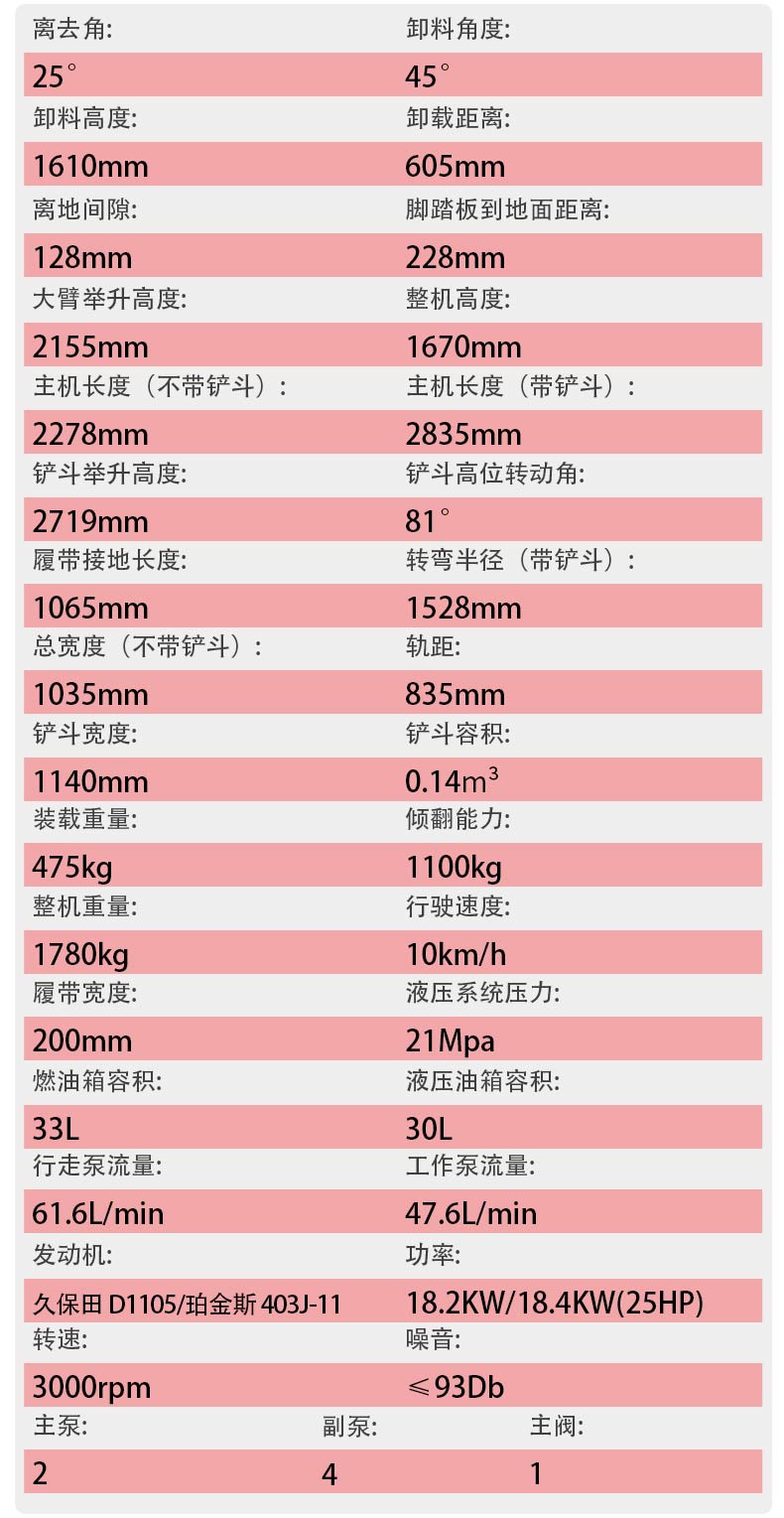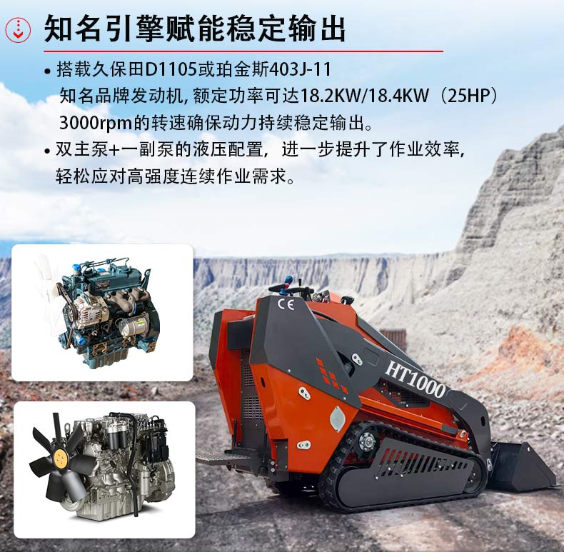 搭载久保田D1105或珀金斯403J-11知名品牌发动机,额定功率可达18.2KW/18.4KW(25HP),3000rpm的转速确保动力持续稳定输出。21Mpa的液压系统压力配合47.6L/min的工作泵流量、61.6L/min的行走泵流量,让大臂举升、铲斗翻转等动作响应迅速、动力充沛。双主泵+一副泵的液压配置,进一步提升了作业效率,轻松应对高强度连续作业需求。
