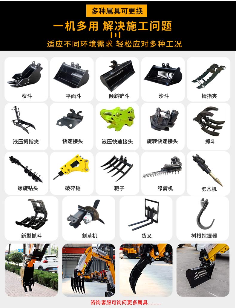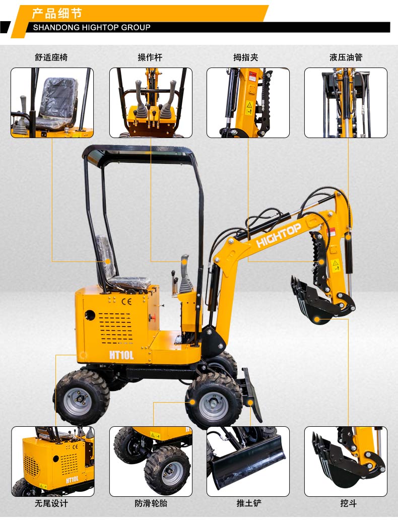 10L轮挖后轮转向加后轮驱动,底盘高,容易通过凹凸路面,不容易托底,前置推土铲,在推土作业和挖掘机工作时支撑地面,提高整车挖掘时的稳定性。