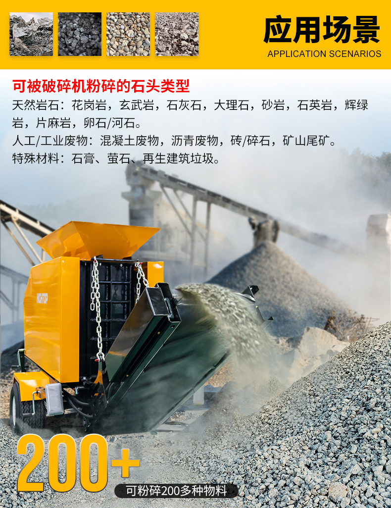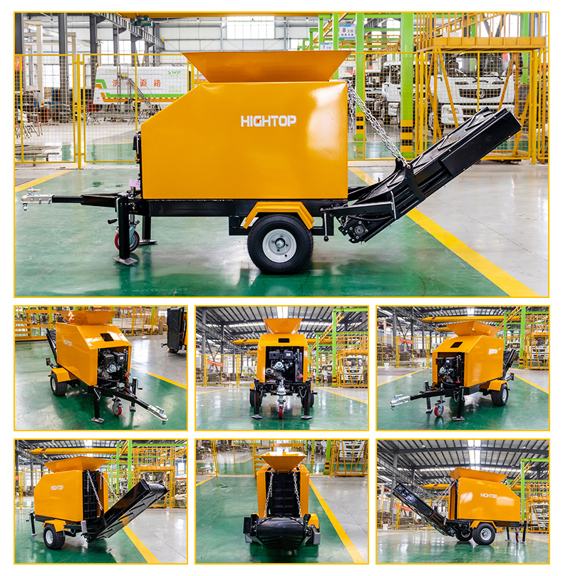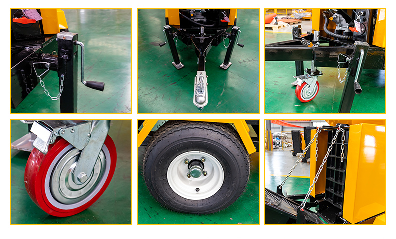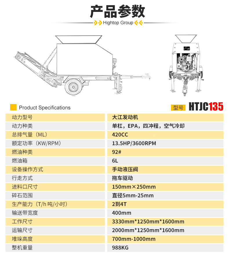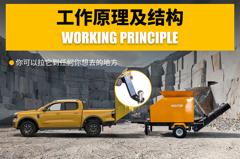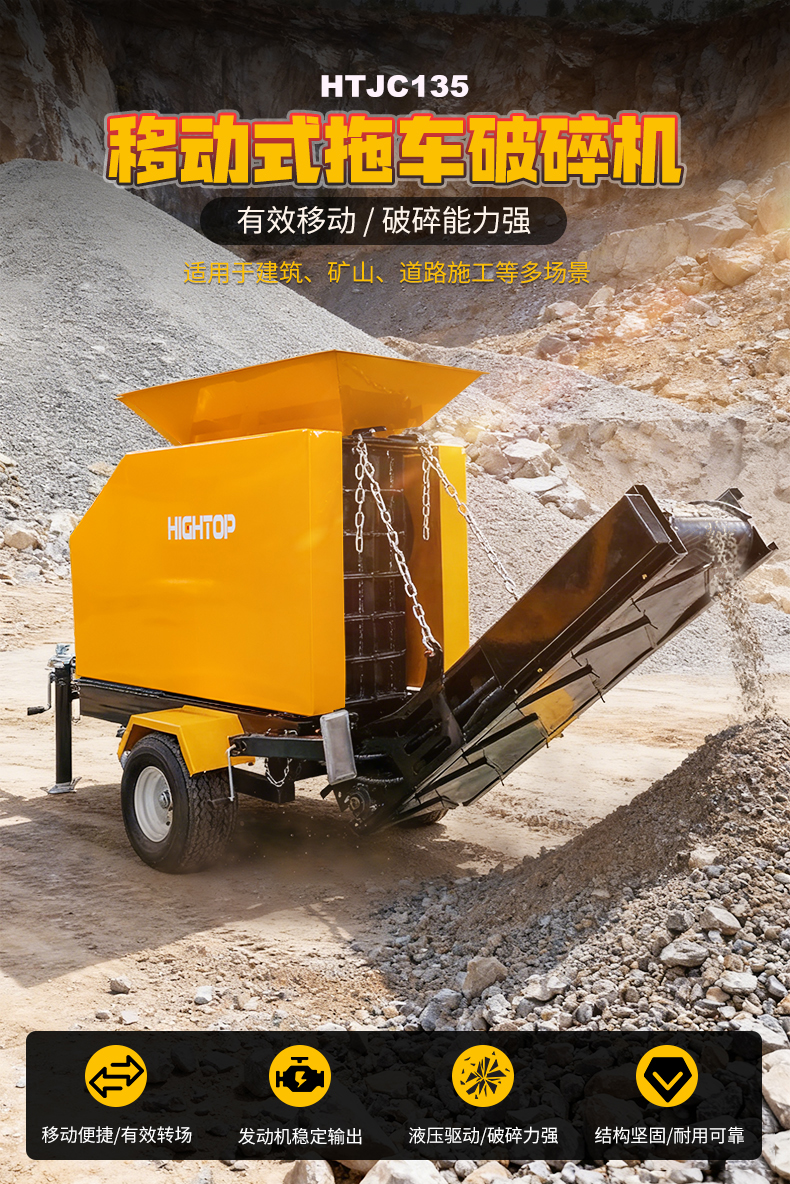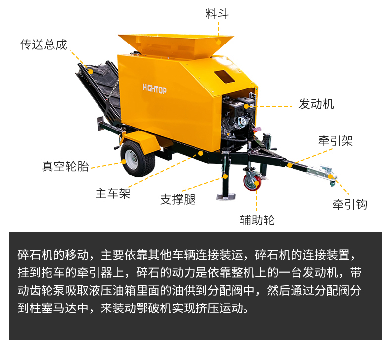 HTJC135拖车碎石机选用的轮胎拖车式结构,主要依靠前车尾部的拖车钩与碎石机上面的连接装置相吻合,固定好后靠前车的行走动力带动这个碎石机转场作业。