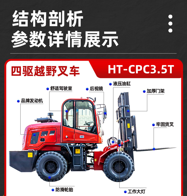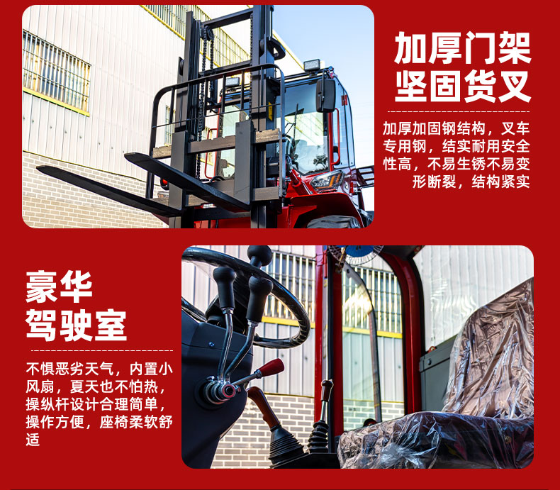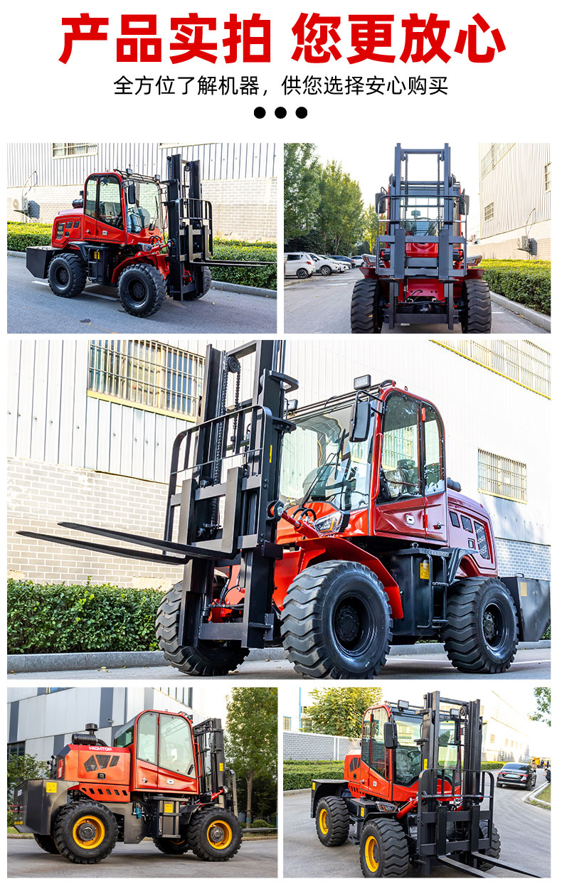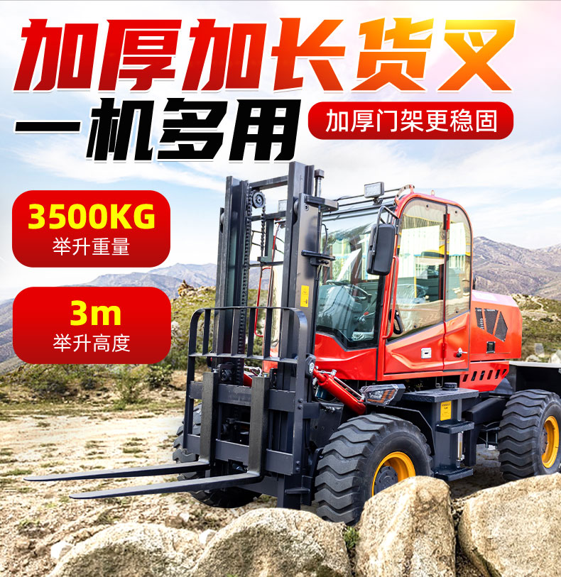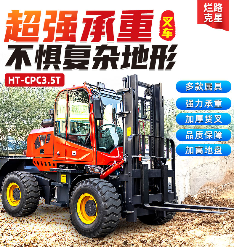 越野式叉车又叫野战叉车,是在机场、码头、车站等路况条件较差的物资集散地装卸物资的设备,它具有良好的机动性、越野性相可靠性。越野叉车的速度高于普通叉车,其机动性显而易见;越野叉车发动机功率大,采用全轮驱动和越野轮胎,因而能够在丘陵、山地、滩头、沙地、雪地、冰上及泥泞道路上行驶,具有良好的越野性能。越野叉车车架有边梁式和中部铰接式几种,门架有直门架式、液压伸缩臂式和连杆前移式等多种,无论哪一种,都能确保作业中的可靠性。特点:车身宽大,能承载不规则和宽大的货物。离地间隙高,可以跨越场地上的障碍物。有四驱功能,可以在泥泞的场地工作。适用场合:建筑工地、矿山、果园牧场、路面粗糙的工矿企业。