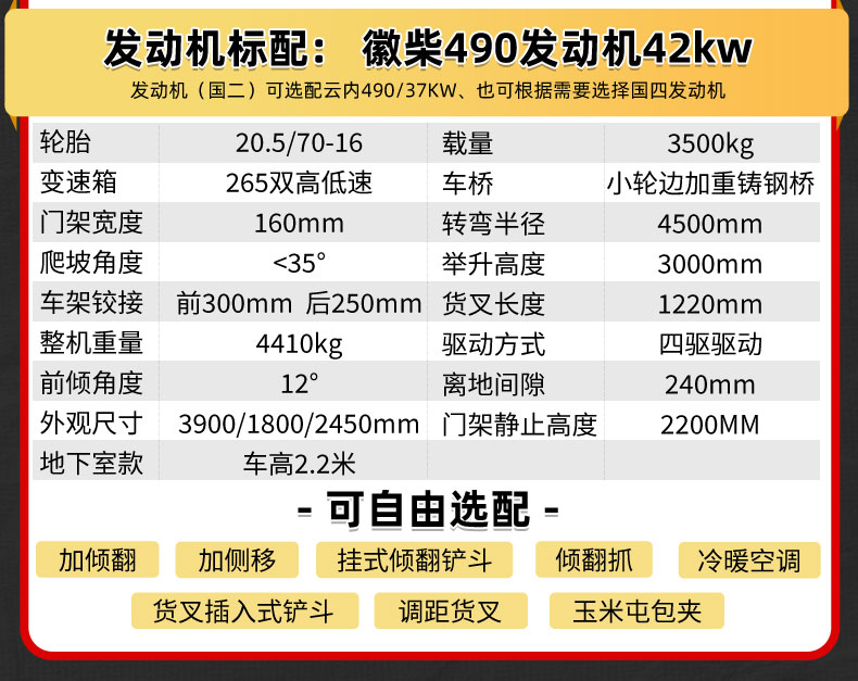 | 发动机(国二) | 标配:徽柴490发动机42kw | 选配:云内490/37KW | |