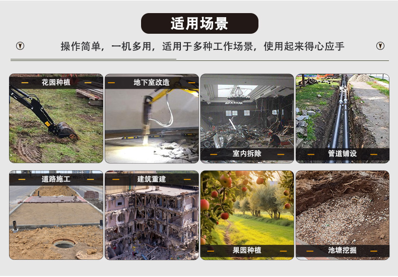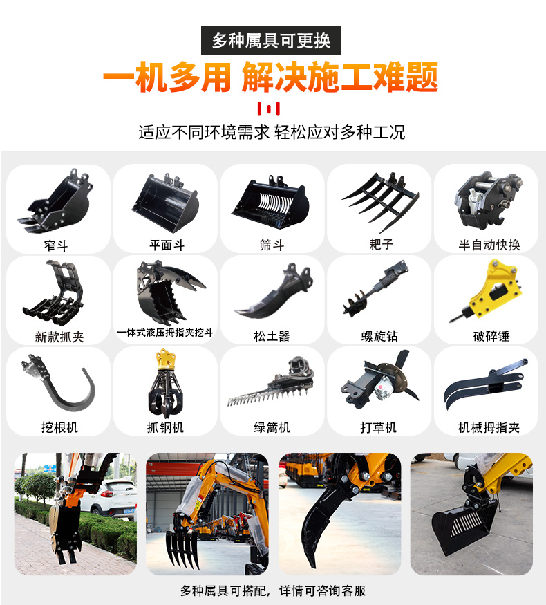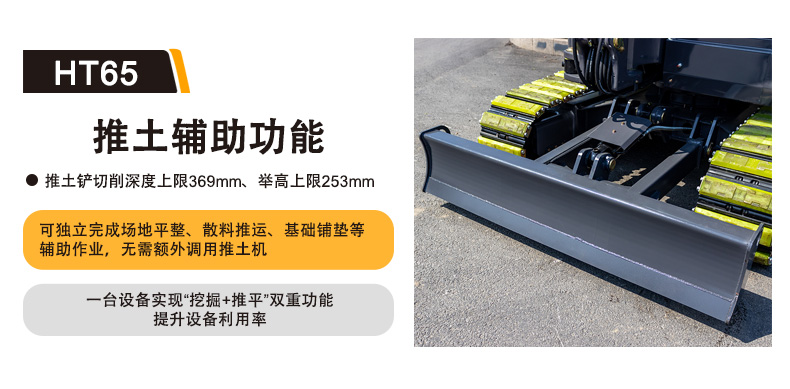8. 推土辅助功能实用:推土铲最大切削深度369mm、最大举高253mm,可独立完成场地平整、散料推运、基础铺垫等辅助作业,无需额外调用推土机,一台设备实现“挖掘+推平”双重功能,提升设备利用率。