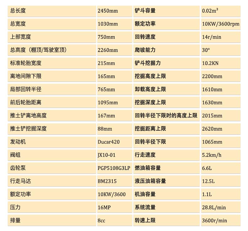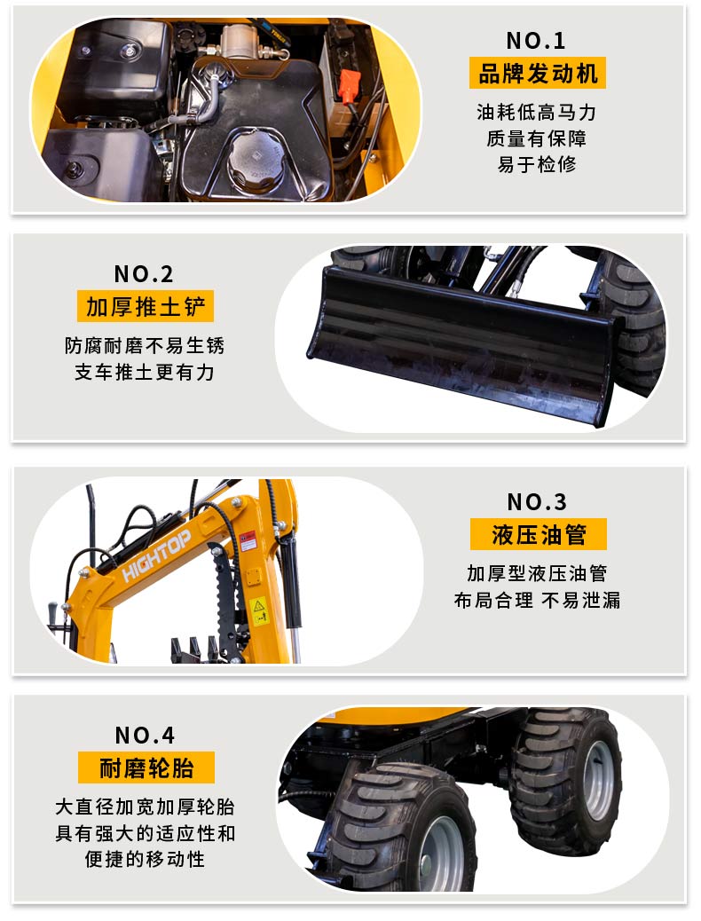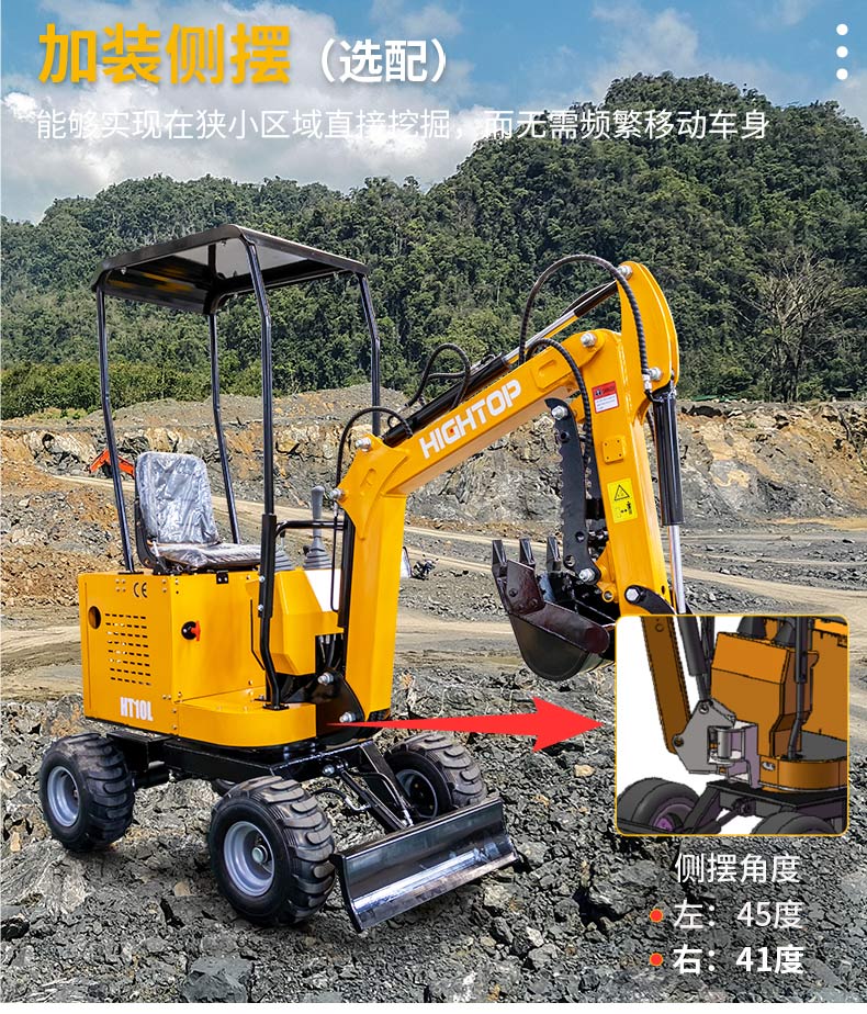 10L轮挖后轮转向加后轮驱动,底盘高,容易通过凹凸路面,不容易托底,前置推土铲,在推土作业和挖掘机工作时支撑地面,提高整车挖掘时的稳定性。
